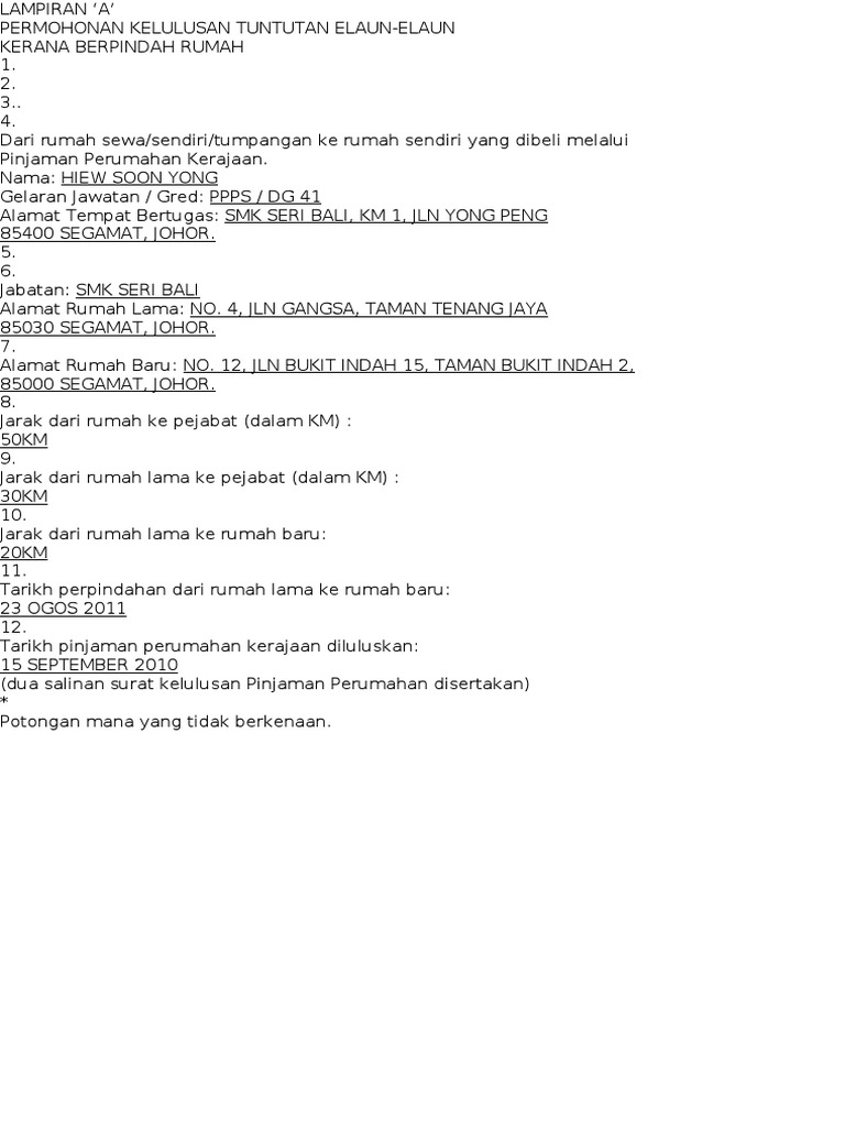 Kebenaran mendiami rumah/pangsa akan dibatalkan oleh jabatan perkhidmatan awam apabila pegawai atau suami/isteri pegawai didapati memiliki rumah sama ada membeli rumah atau pembinaannya rumah sendiri yang siap untuk. Borang permohonan tuntutan elaun pindah rumah jabatan mp3 & mp4. Panduan proses permohonan tuntutan langkah 8 : Tempat menginap pegawai selain hotel atau rumah rehat. Panduan ini bertujuan untuk menetapkan kadar dan syarat bagi seseorang pegawai di universiti malaysia pahang menuntut elaun perpindahan rumah.