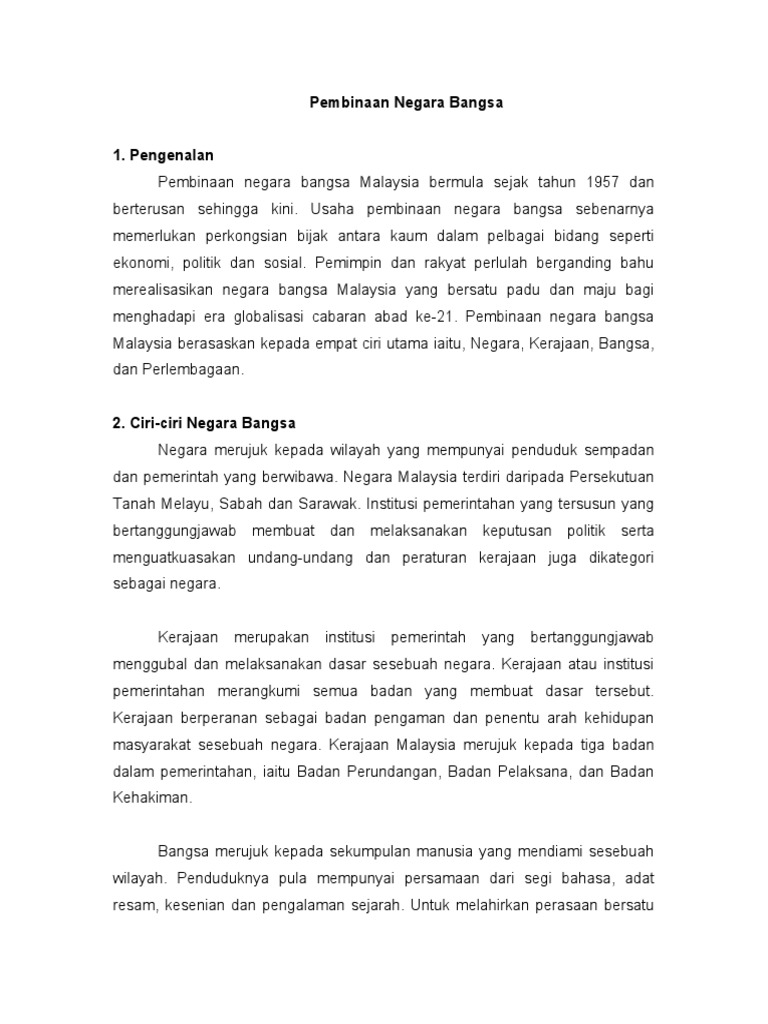 Dibentuk melalui penggunaan satu bahasa kebangsaan,pengamalan kebudayaan dan rukun negara. Kesinambungan pembinaan negara dan bangsa malaysia dapat dilihat dengan jelas pada zaman kerajaan johor dan terengganu dengan perlembagaan bertulisnya, kerajaan kelantan dengan sistem. Pembinaan negara dan bangsa ke arah kemunculan negara malaysia yang berdaulat 1. Jelaskan perkembangan pembinaan negara bangsa malaysia. Kemerdekaan, masalah pembinaan negara bangsa malaysia masih dan tampak. Untuk mencapai matlamat perpaduan negara. · rakyat mesti memelihara jati diri bangsa. Idea pembentukan negara bangsa malaysia tidak berlaku dalam tempoh yang singkat. Pembinaan negara bangsa amat penting bagi sebuah negara yang berbilang kaum dan agama seperti malaysia. Kewujudan bangsa malaysia adalah utopia. Perjanjian malayan union semua negeri melayu bersekutu dan negeri melayu tidak bersekutu serta dua negeri selat, disatukan. Pembinaan budayanya tidak berjalan berterusan. Ia berlaku melalui pertembungan budaya yang pelbagai.