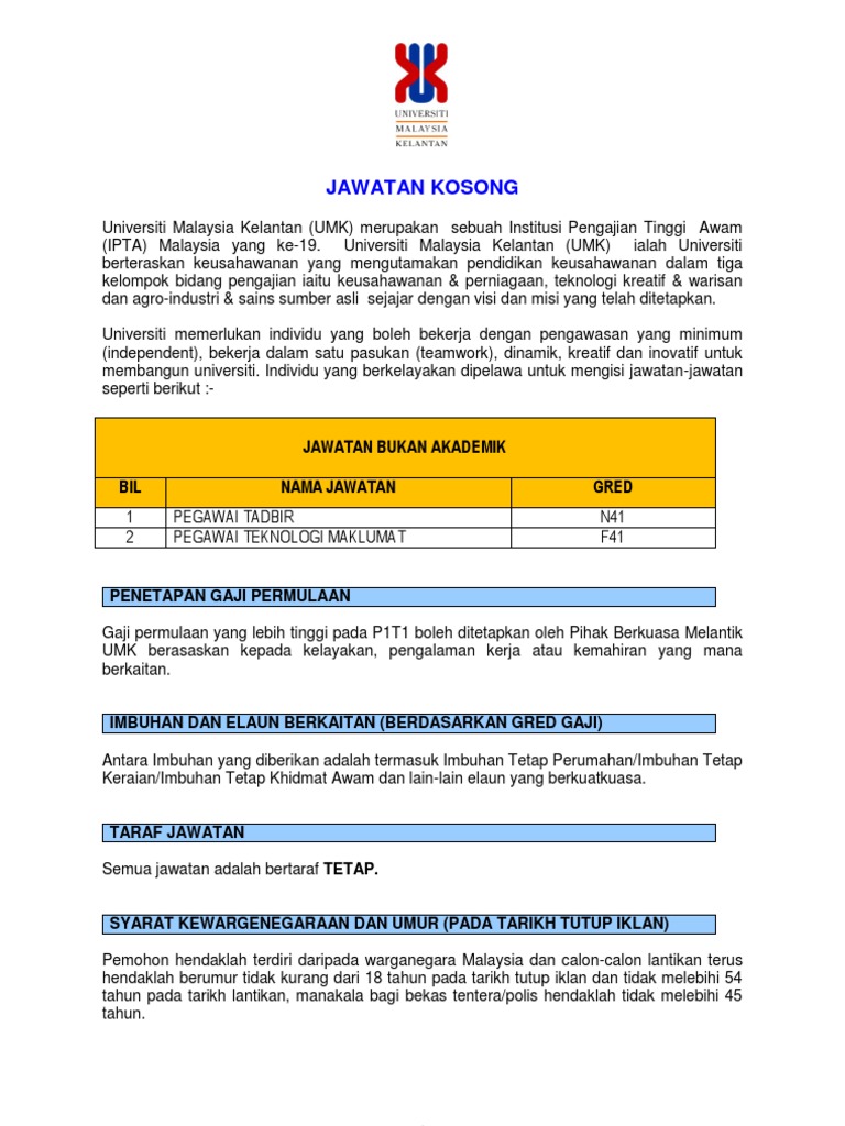 Jika terdapat sebarang masalah atau pertanyaan mengenai permohonan jawatan kosong, anda boleh. Bagi calon yang berminat untuk memohon jawatan kosong ini, calon hendaklah membuat permohonan secara online melalui. Permohonan adalah dipelawa kepada warganegara malaysia bagi mengisi kekosongan jawatan di universiti malaysia kelantan (umk). Cari jawatan kosong malaysia terkini 2021. Portal jawatan kosong kerajaan dan swasta di malaysia, jawatan kosong, tip mendapatkan kerja, kerja kerajaan, jawatan kosong spa, kerja kosong terkini