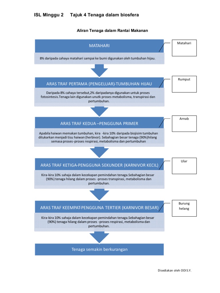 2.1 aliran tenaga dalam ekosistem • rantai makanan menunjukkan hubungan pemakanan dan pemindahan tenaga daripada pengeluar kepada pengguna • gabungan beberapa rantai makanan membentuk siratan makanan. Aliran tenaga dalam rantaian makanan (ekosistem, hutan hujan tropika) matahari merupakan punca tenaga bagi semua kehidupan. Get unlimited access to this and over 100,000 super. Hubungan dan interaksi antara organisma dalam sesuatu ekosistem membolehkan aliran tenaga berlaku apabila proses makan dimakan berlaku. With super, get unlimited access to this resource and over 100,000 other super resources.