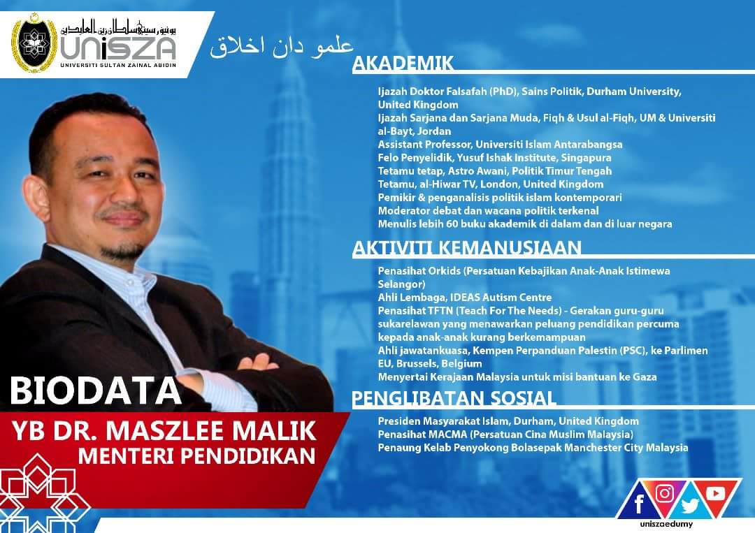 See full list on id.wikipedia.org May 19, 2018 · individu yang dilantik menjadi menteri pendidikan malaysia yang baharu adalah dr. May 20, 2018 · dr maszlee is phd alumni of the actual durham university, uk. On 18 may 2018, maszlee was appointed as malaysia's new minister of education after prime minister tun mahathir mohamad vacated the post just one day after taking it. Beliau fasih bertutur dalam beberapa bahasa. Mewakili parti pribumi bersatu malaysia (bersatu), yb dr. Dr maszlee malik biodata ringkas menteri pendidikan malaysia yang baharu iluminasi. See full list on id.wikipedia.org Maszlee joined the ph coalition's component party, bersatu in march 2018 and defeated incumbent liang teck meng for the simpang renggam constituency in the 2018 general election (ge14). Maszlee malik adalah ahli parlimen simpang renggam. Presiden dewan organisasi menteri pendidikan asia tenggara (seameo) 2. Dr maszlee malik biodata ringkas menteri pendidikan malaysia yang baharu iluminasi. Sebagai seorang menteri, maszlee telah membuat perubahan dalam sistem pendidikan malaysia yang dianggap tidak berguna dan inkonstitusional oleh banyak orang.
