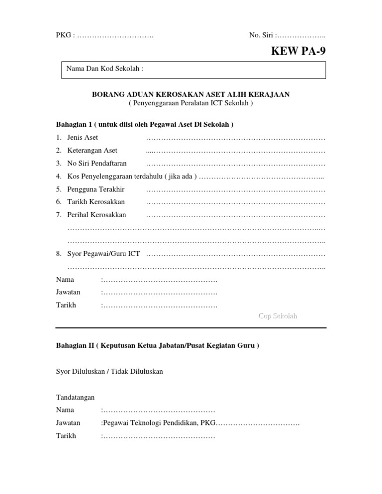 Kew pa 9 borang aduan kerosakan aset alih. Kew.pa 9 borang aduan kerosakan aset alih kerajaan bahagian i (untuk diisi oleh pegawai aset) 1. Tawaran boleh dibuat dengan menggunakan borang tender pelupusan aset kerajaan (kew.pa 22) yang boleh diperolehi di alamat seperti di para 5. For more information and source, see on this link : 7.kew.pa 7 (senarai aset di lokasi) saravana sundari k.